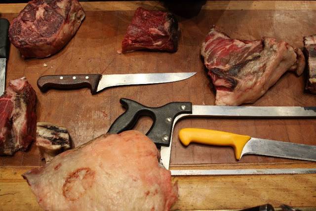 Preferimos comprar productos frescos ya que hemos desarrollado nuestro propio procedimiento de maduración a través del tiempo, la temperatura, la humedad y la ventilación. Nuestra carne madura durante aproximadamente 4-6 semanas. Debido a que la carne pierde humedad, su sabor se vuelve mucho más intenso y su estructura más tierna.