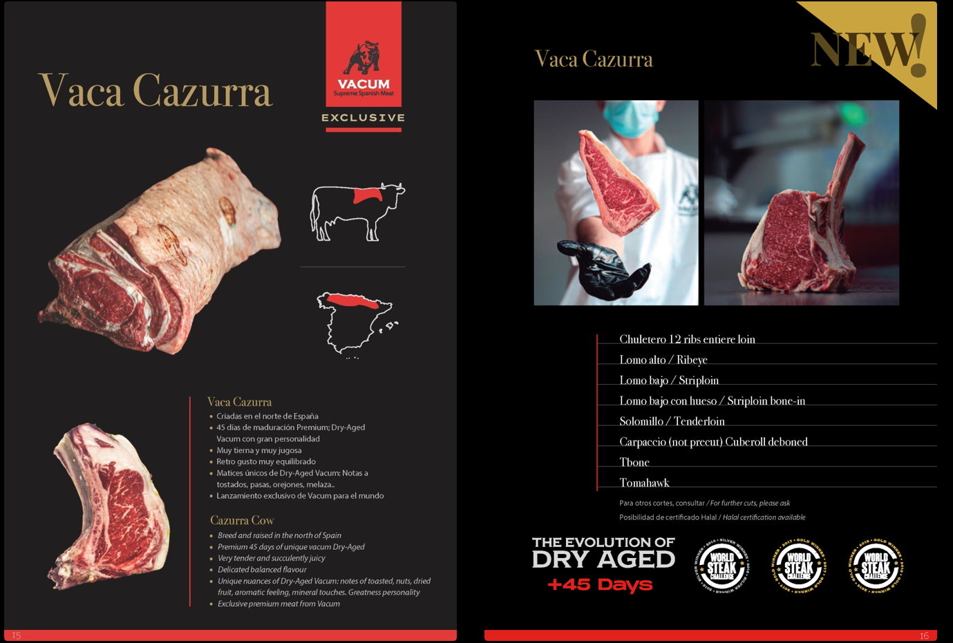 La vaca cazurra es el último lanzamiento en exclusiva de Vacum. Nuestro trabajo de campo y ganas de seguir ofreciendo novedades, nos ha llevado en este caso a encontrar un producto muy redondo. Seleccionamos personalmente cada animal que entra en Vacum, en esta ocasión, trabajamos animales más jóvenes, más tiernos y muy veteados. Una vez han pasado el primer filtro, aplicamos nuestro galardonado dry-aged como siempre lo hemos hecho; despacio y jugando no sólo con temperaturas y humedades si no con la micología del ambiente. El que ha probado una chuleta madurada Vacum, recuerda ese sabor y olor inconfundibles de una maduración bien hecha. En toda la vaca Cazurra, después de mucho I+D, pruebas, ensayos y ajustes, nuestra experiencia y saber hacer, nos dice que el equilibrio perfecto, para este tipo de animales, se encuentra alrededor de los 45 días de maduración. Pensamos que son los días más óptimos para esta carne. Una vez pasados esos 45 días, encontramos un producto final super balanceado. Tierno como era de esperar y con un gusto muy fino de maduración Vacum inconfundible. Tanto la proteína como la grasa, después de 45 días, evoluciona a unos sabores y matices con mucha personalidad, melosos, dulces, tostados. Toda una evolución del Dry-Aged Vacum para todos los públicos.